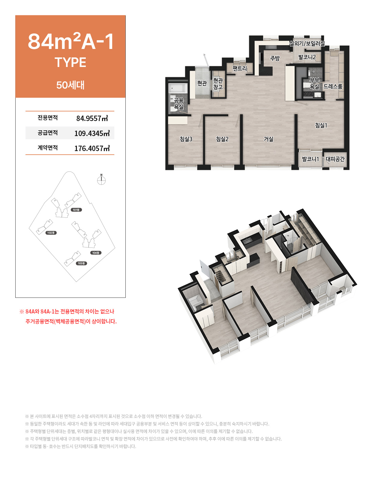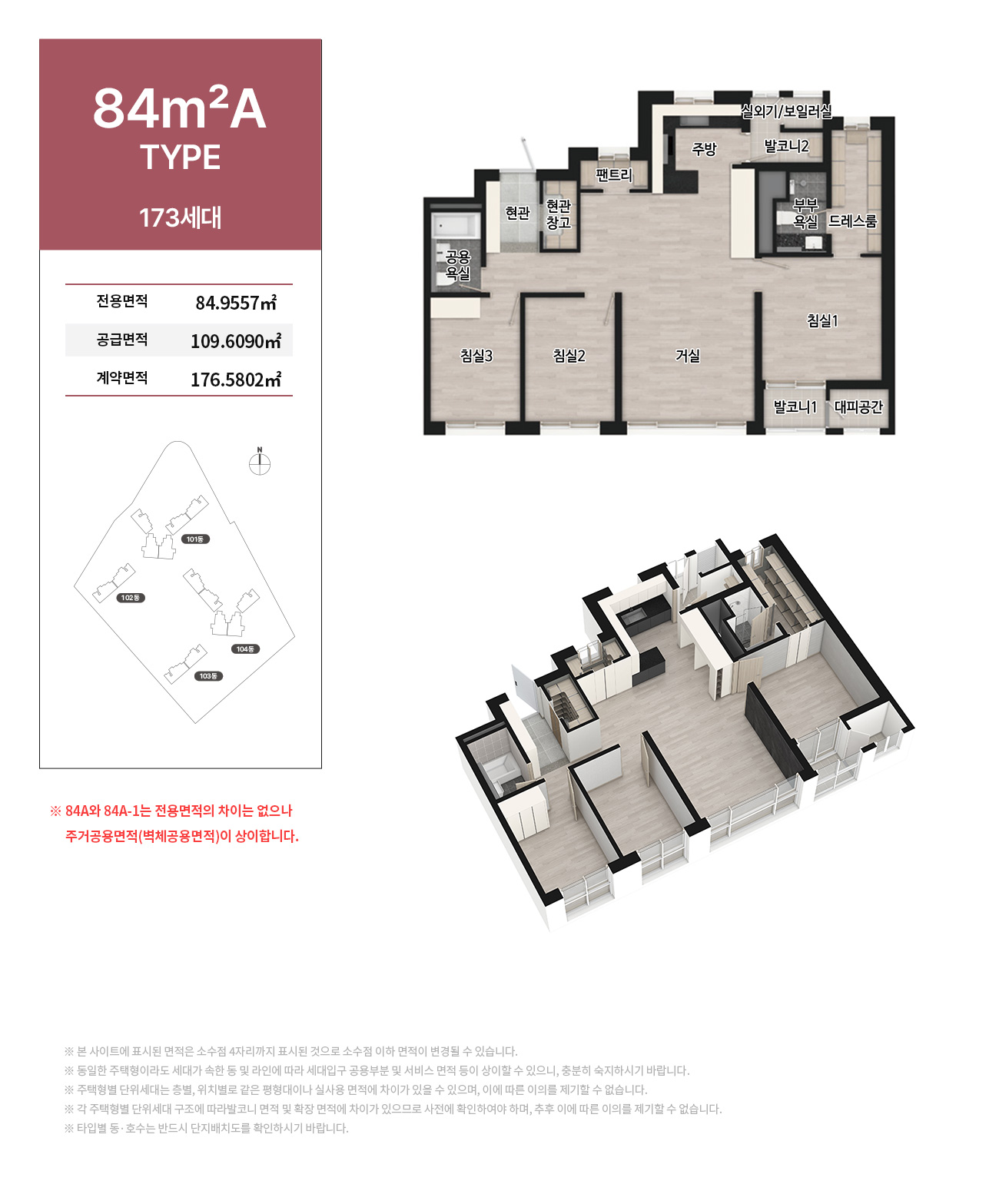 ※ 동일한 주택형이라도 세대가 속한 동 및 라인에 따라 세대입구 공용부분 및 서비스 면적 등이 상이할 수 있으니, 충분히 숙지하시기 바랍니다.